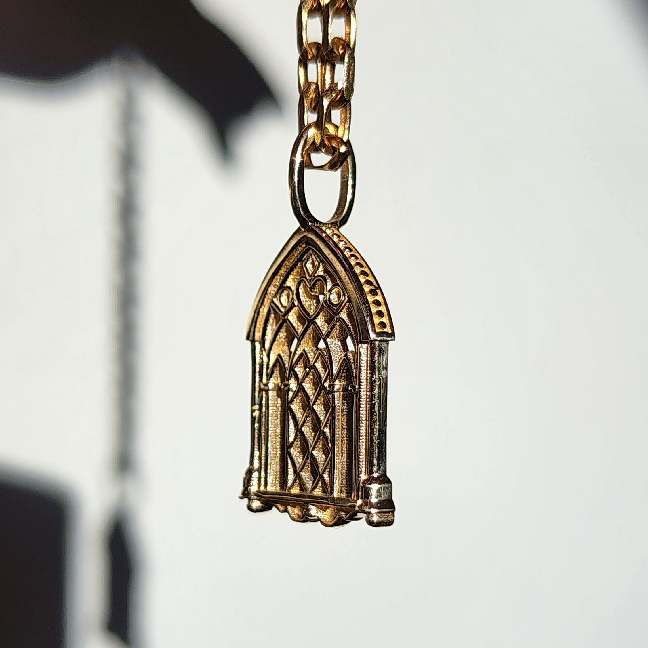 Capture the light. This pendant holds the serene beauty of cathedral windows, with each golden segment like a stained-glass window from a folklore. A wearable piece of fairytale.
