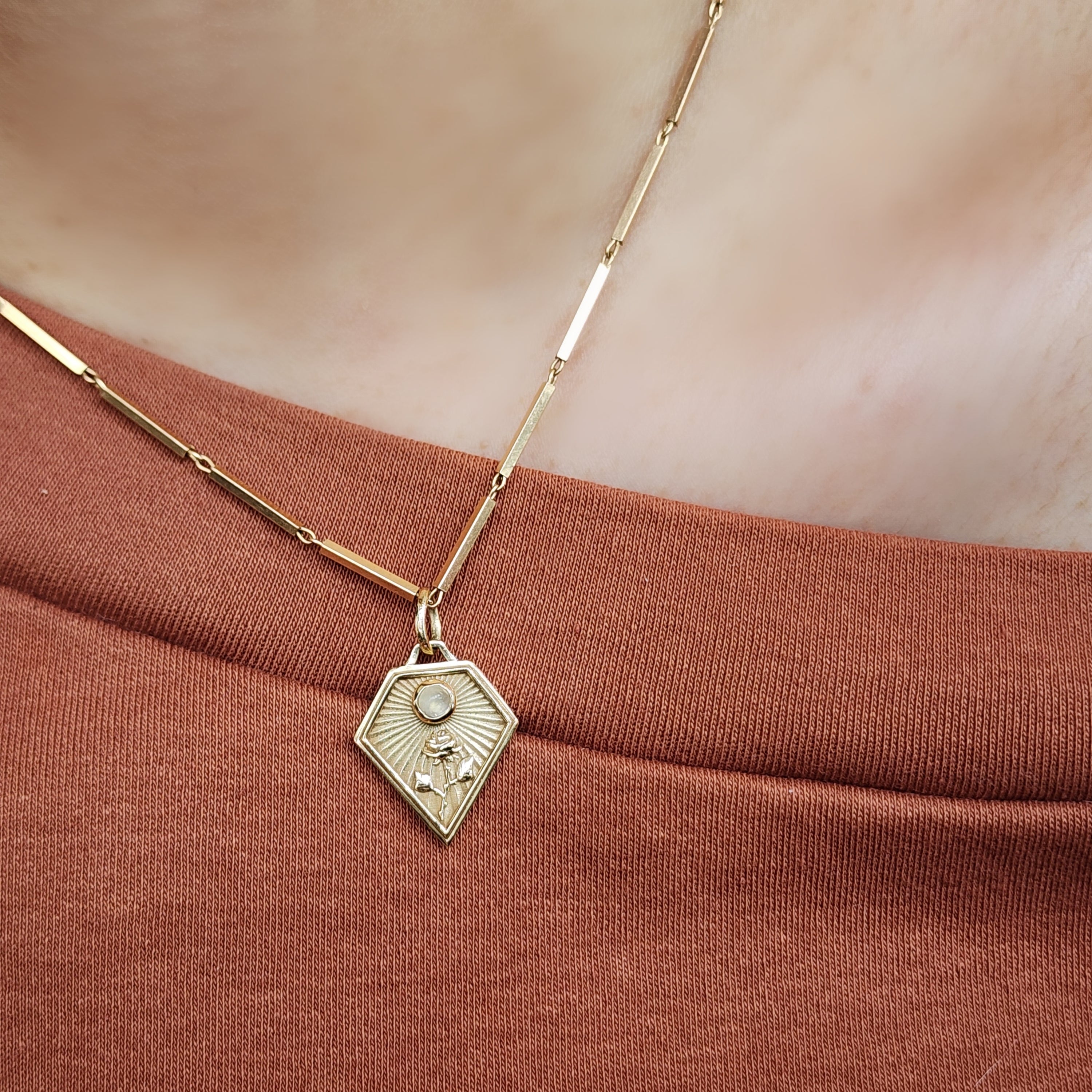- Model wearing rose with grey moonstone