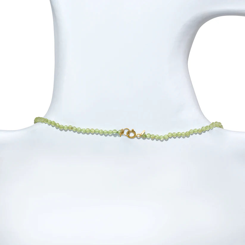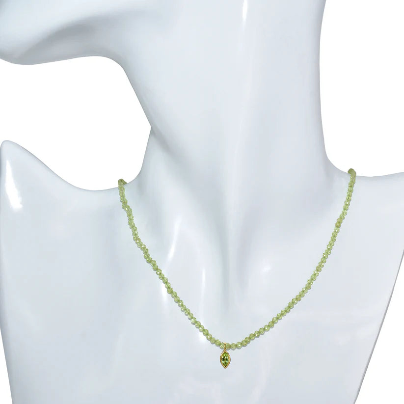 A delicate collision of nature and luxury, this enchanting necklace features a 14k solid gold peridot marquise eye charm suspended from a faceted gemstone beaded strand.