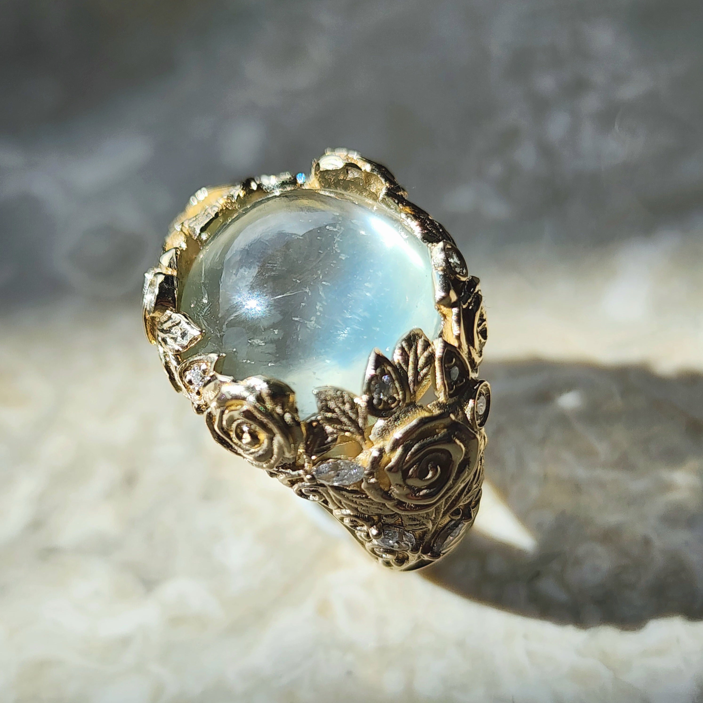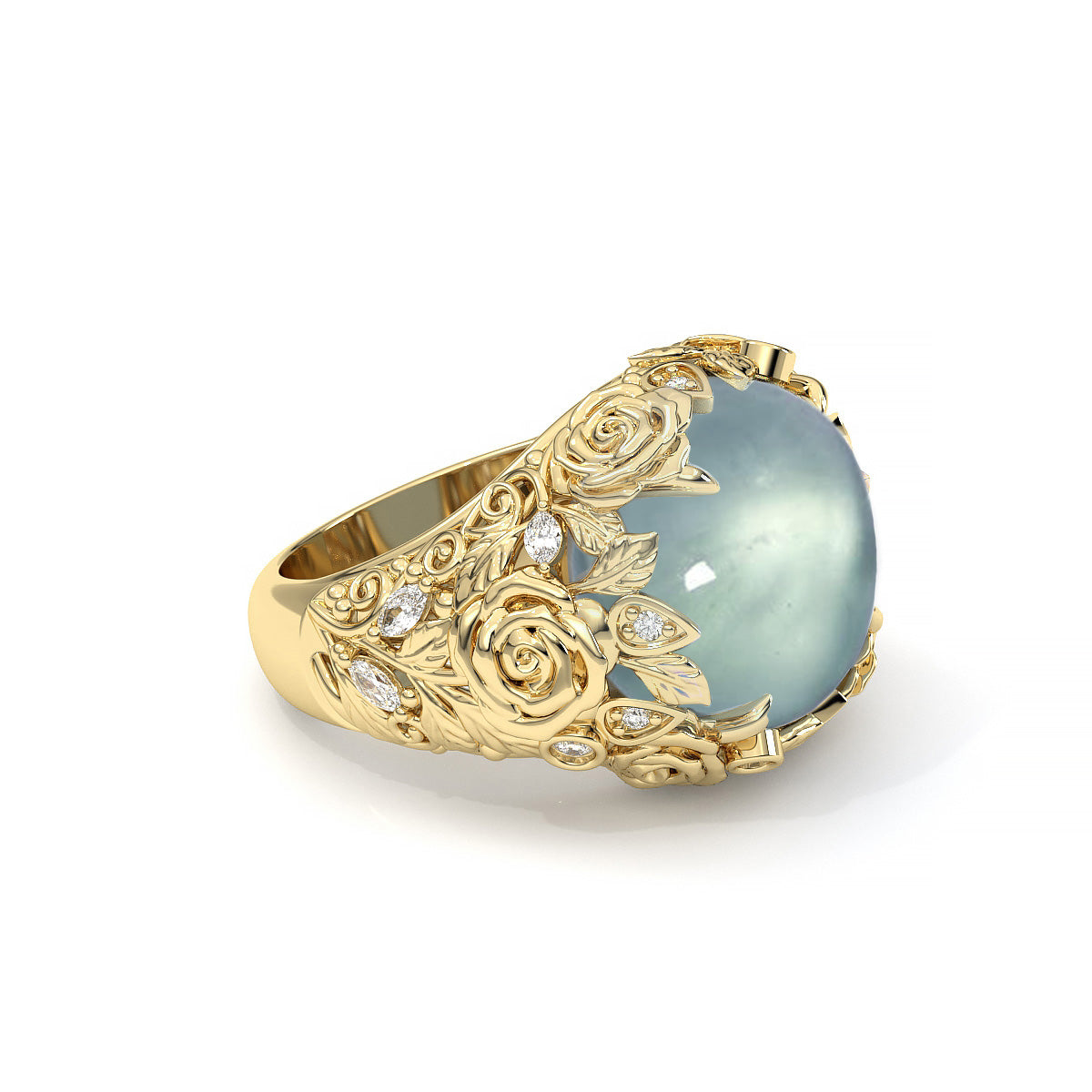 A whisper of magic from an enchanted garden, this ring features a delicate rose vine meticulously crafted to cradle a captivating green moonstone. The stone itself seems to hold a secret, its internal glow shimmering like moonlight trapped in a dewdrop. Worn on the finger, it’s not just jewelry; it’s a tiny, wearable piece of a fairy tale.