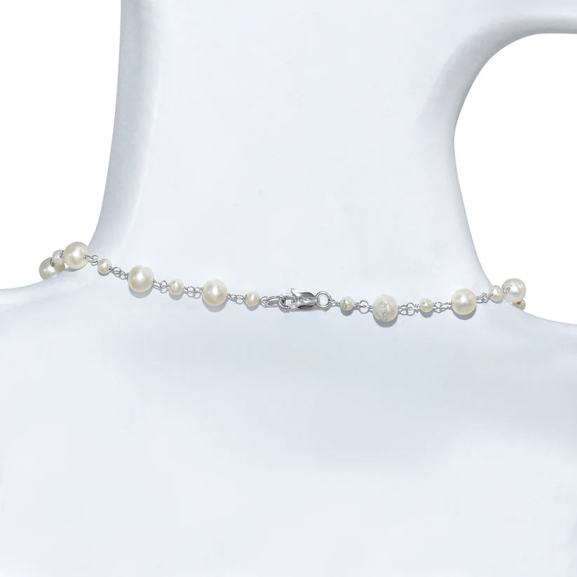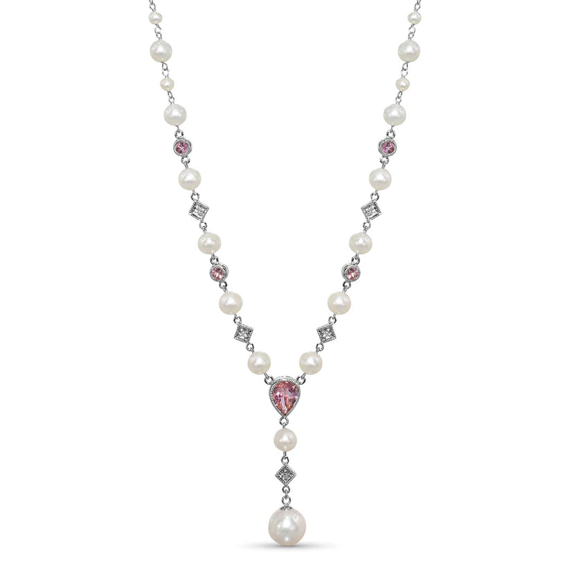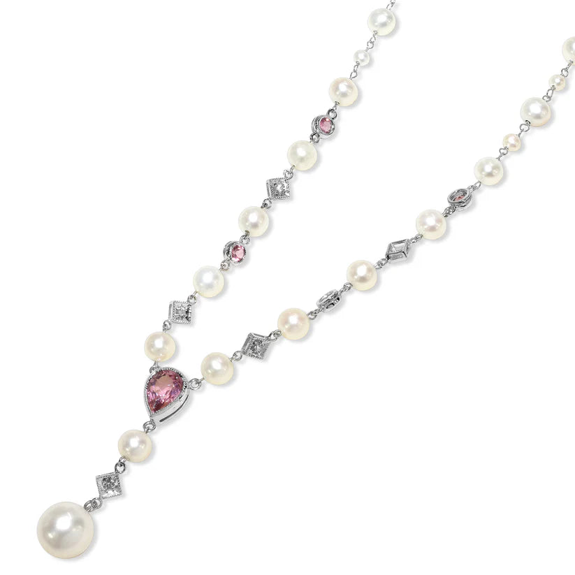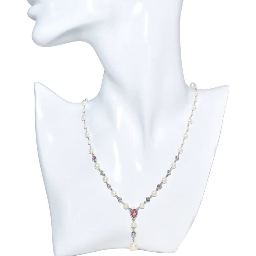 This exquisite necklace is woven from moon-touched white gold. Strung along its length are lustrous pearls, like a string of bubbles rising from a mermaid's secret grotto. But the true treasure is the pendant: a teardrop of pink tourmaline, glowing with the soft, blushing pink hue, a piece of the ocean's most tender magic.