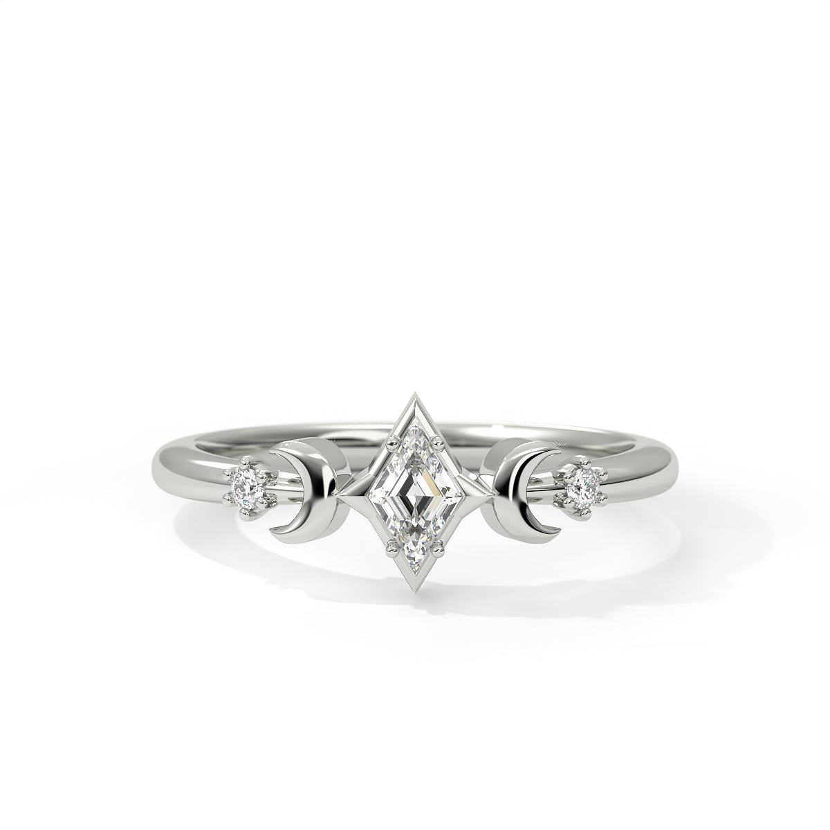A brilliant lozenge-cut diamond takes center stage, cradled between two celestial crescents. Each moon is adorned with a twinkling accent diamond, making this ring a talisman for the dreamer, the mystic, and the forever Moonchild.