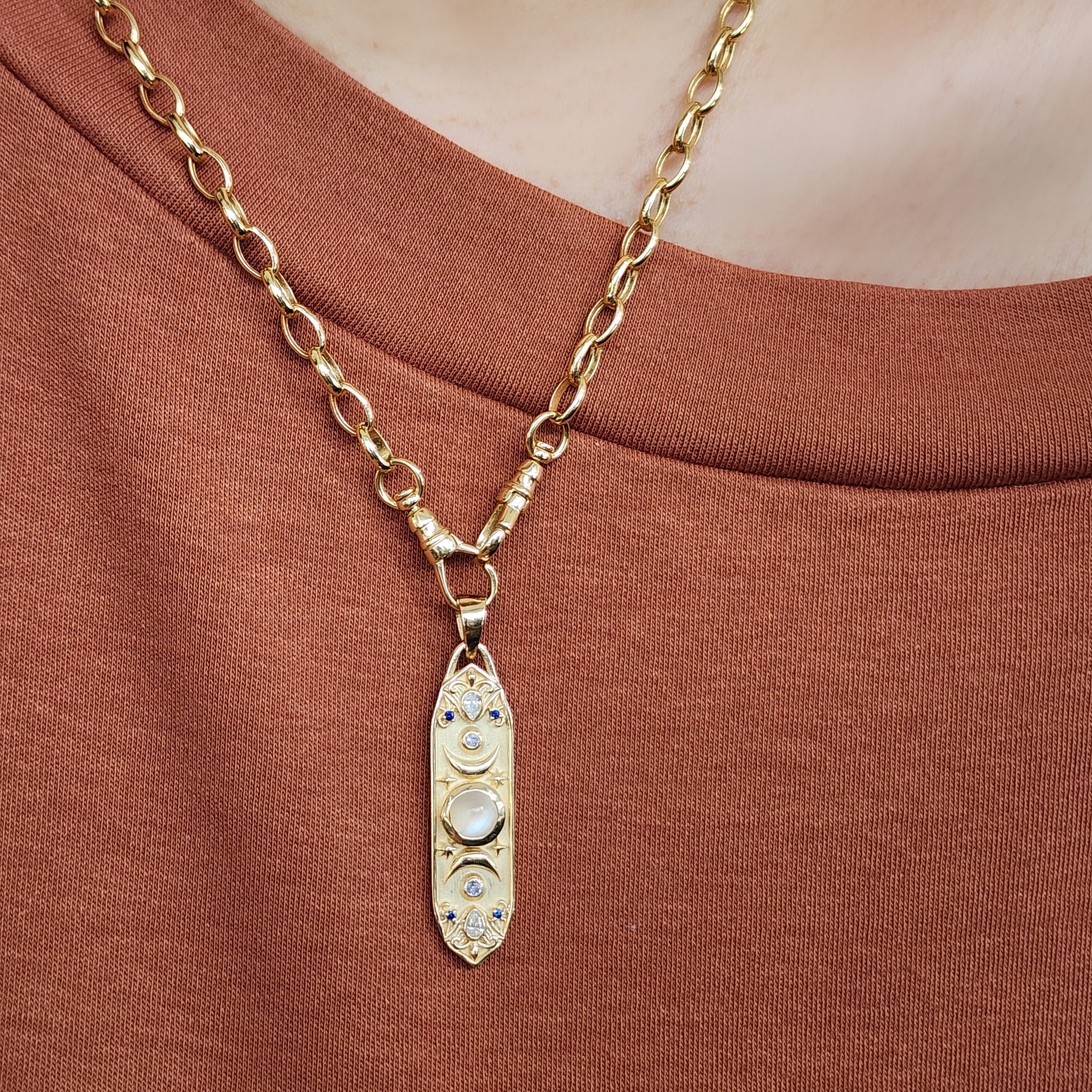Carry the serene and mystical magic of the cosmos with you. The Moon Phase Pendant is a celestial masterpiece, a delicate capture of the moon’s eternal and enchanting dance across the night sky, designed for those who are guided by dreams and intuition.