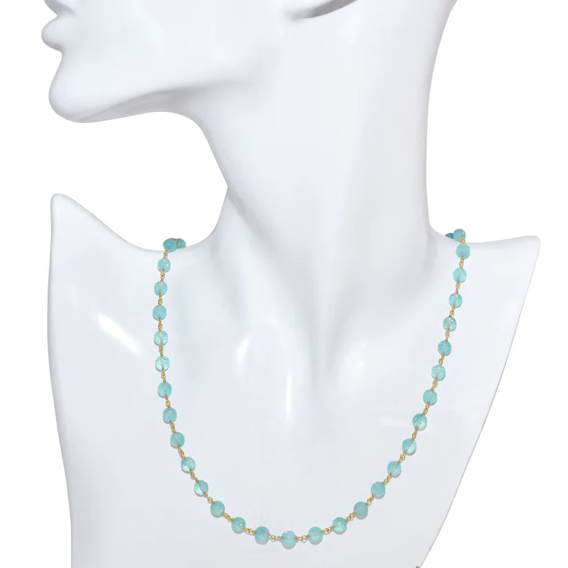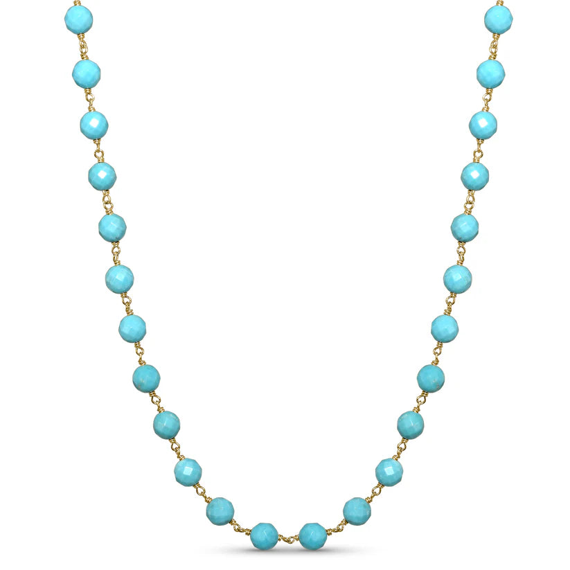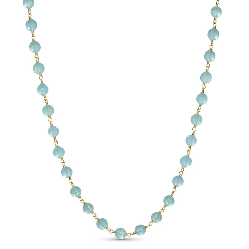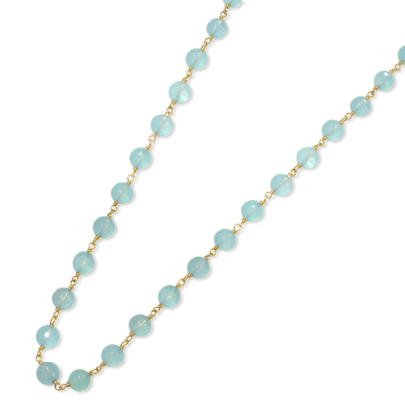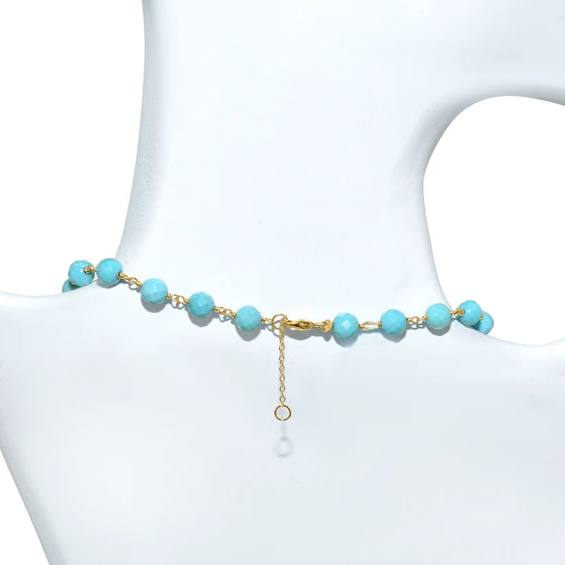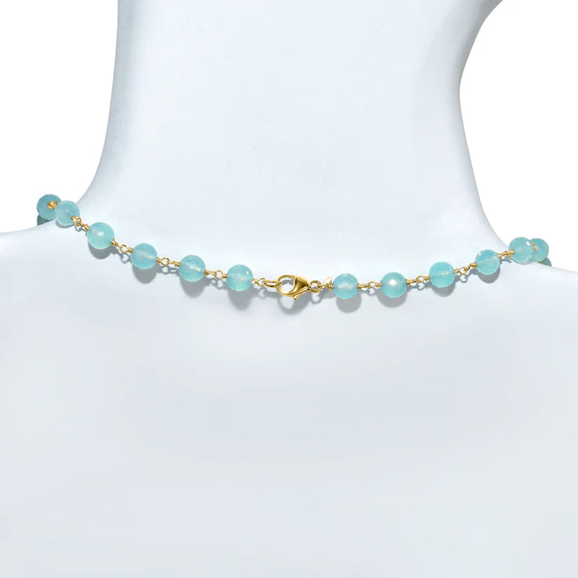 This station necklace is made with beads of serene turquoise or chalcedony, the color of a genie's magic and a tranquil sea. Light, layered, and effortlessly cool, it’s a piece that whispers of desert caravans, hidden treasures, and free-spirited adventures.