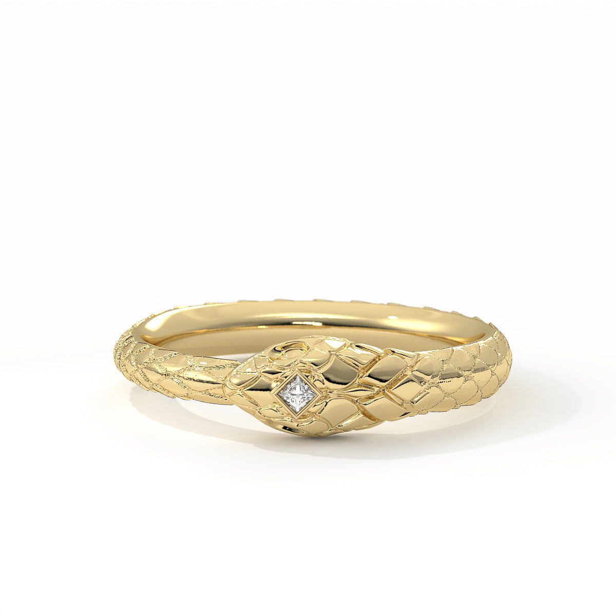 Where ancient magic meets modern elegance. This solid gold snake coils into a perfect symbol of eternity, crowned with a brilliant princess-cut diamond. For the eternal dreamers and modern mystics.