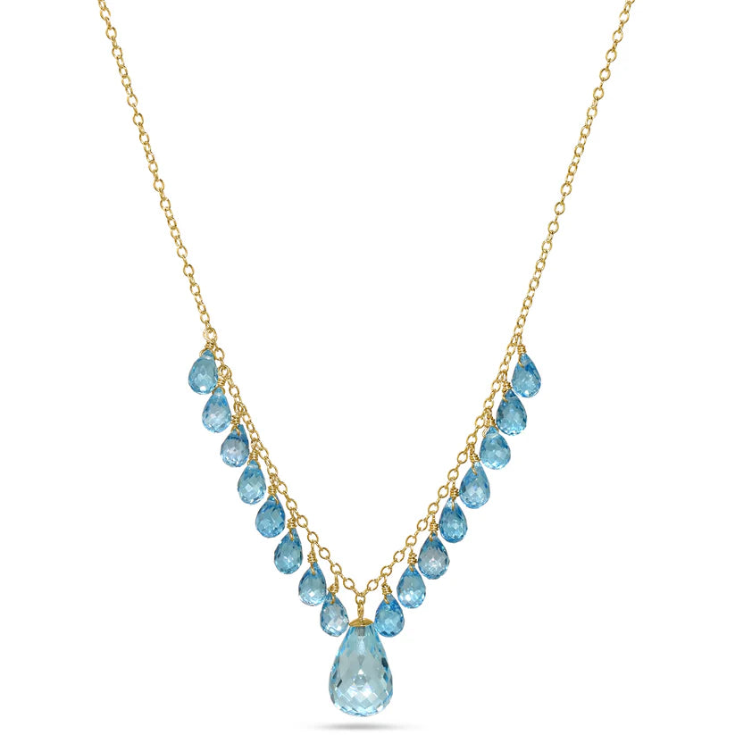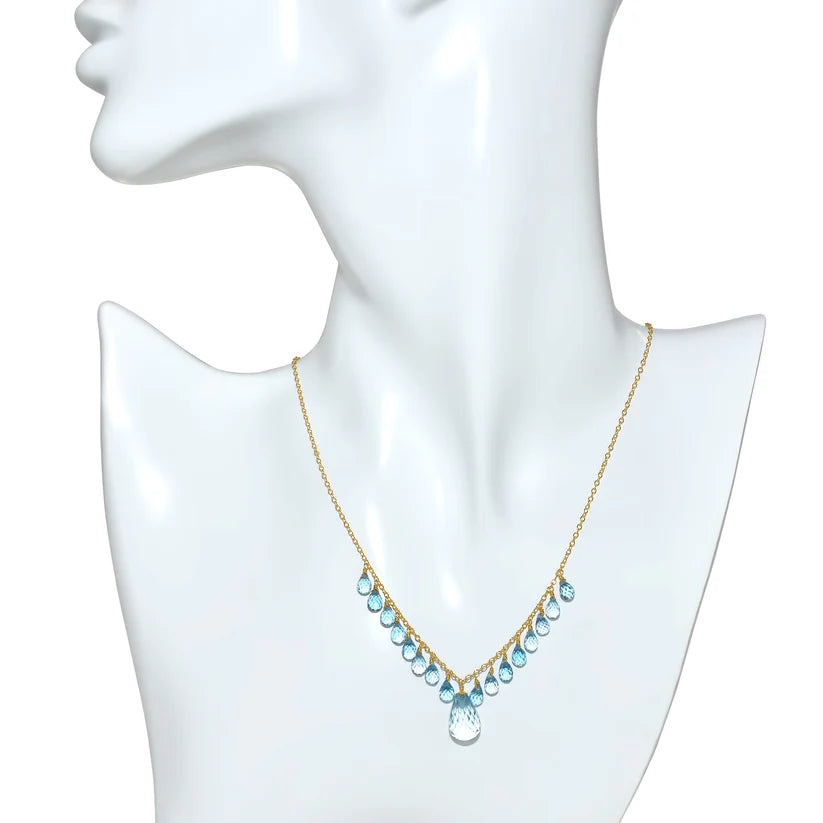 The flawless aquamarine, carved into perfect water drops, holds the serene blue of a tranquil lagoon. Suspended from a delicate chain, it seems to forever be falling, capturing a moment of pure, frozen magic.